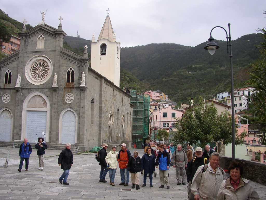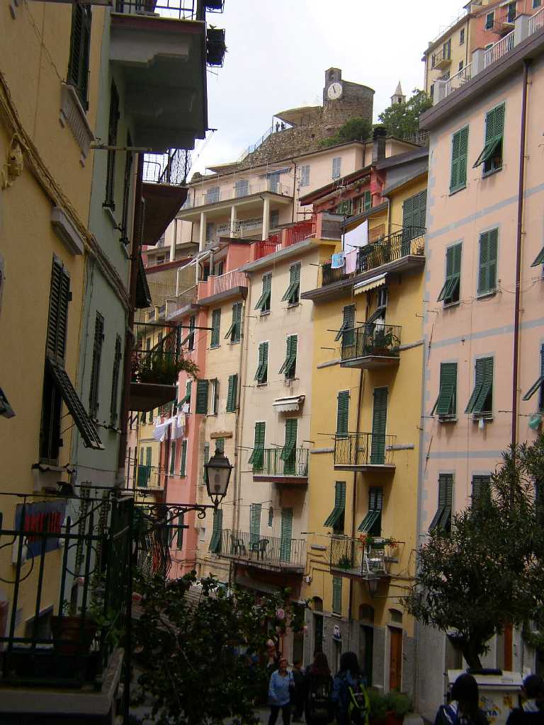 Aussichtspunkt bei der Kirche San Giovanni Battista . Die Treppengasse vollends hinauf, vorbei an einer kleinen Kapelle, um die gegen die Einfälle der Sarazenen errichtete Burgfestung aus dem 16. Jh. zu erreichen. Herrlicher Blick auf das Dorf, den kleinen Hafen, das Meer, auf die andere Talseite zum Friedhof und noch etwas höher gelegen, zur Wallfahrtskirche Madonna di Montenero. Von der Ruine der Genueser Burg schlendern wir langsam Treppenwege hinunter zum Bahnhof. Das Gassengewirr, die beeindruckende Aussicht, ein stimmungsvolles Bild an diesem Donnerstag Vormittag. |