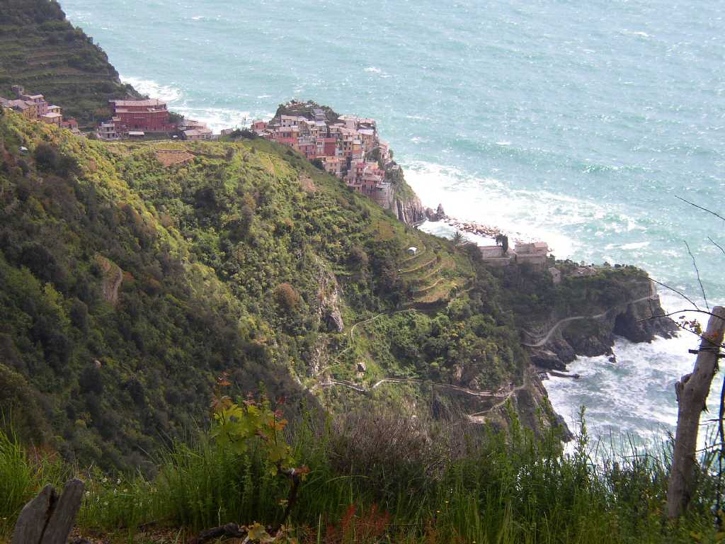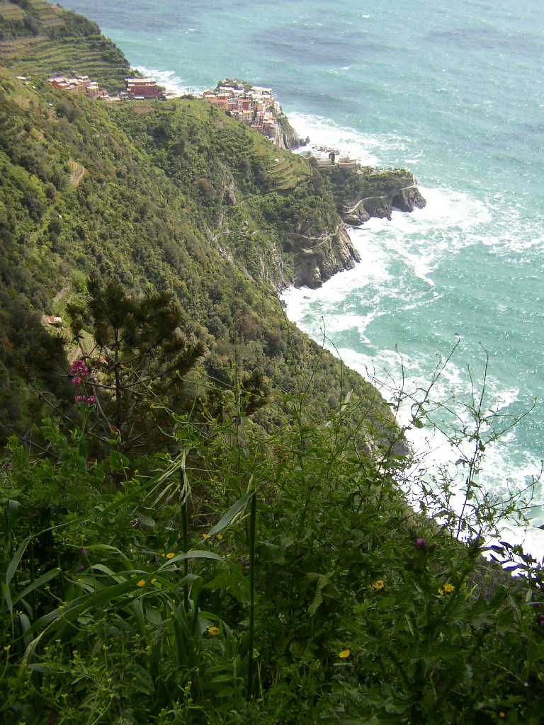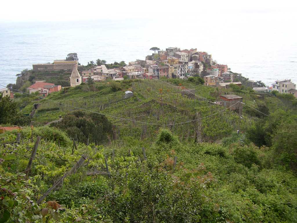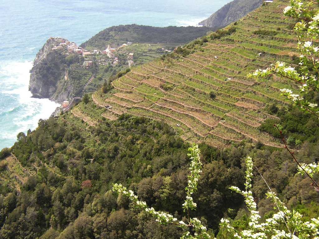 | Sehr beeindruckend, eine großartige Landschaft, mittendrin das kleine Dorf Volastra .Nach wenigen Schritten stehen wir vor der Wallfahrskirche "Nostra Signora della Salute", aber leider geschlossen. Dafür öffnet sich nach einem kurzen Stück der Blick auf das Meer, weit unten auf einem vorgelagerten Felsen liegt Manarola und ein wenig weiter nach rechts, wird der Blick frei auf Corniglia und auf das große, beeindruckende Gebiet der terrassenartig angelegten Weinfelder. Der Weg verläuft eben durch ein wahres Meer von Weinbergen, sehr, sehr beeindruckend. Die kilometerlangen Hangreihen sind bis auf eine Höhe von 500 Metern mit einheitlichen Terrassen durchzogen. Es ist fast unvorstellbar, was von Menschenhand hier geschaffen wurde. |