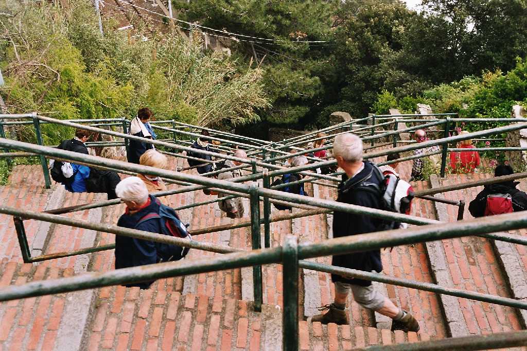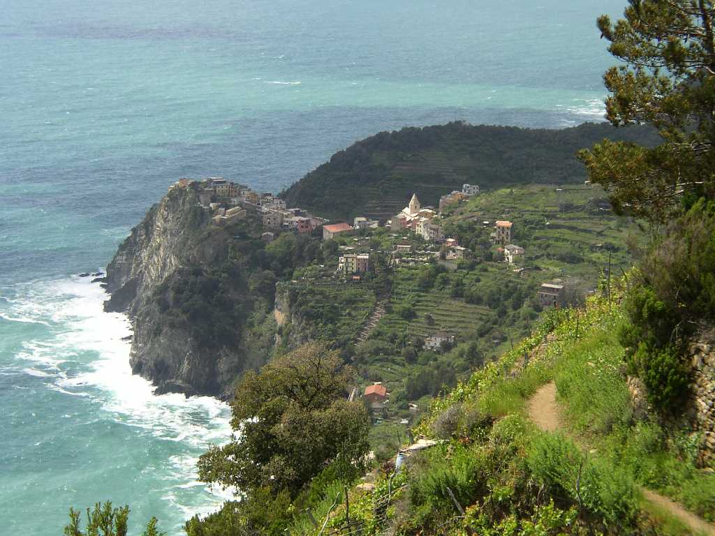 | Auf einem fast ebenen schmalen Pfad, gelegentlich über Treppen, queren wir ein 1997 niedergebranntes Waldstück. Der Pfad am oberen Waldrand zweigt dann nach links ab. Von hier Abstieg durch Olivenhaine in einem Taleinschnitt und später durch Weinterrassen nach Corniglia. |