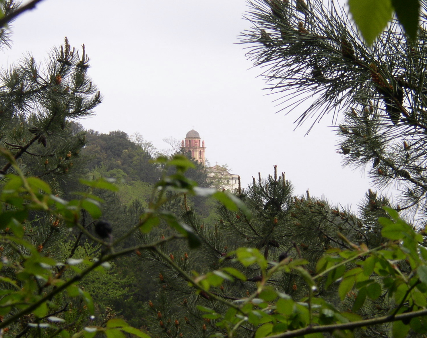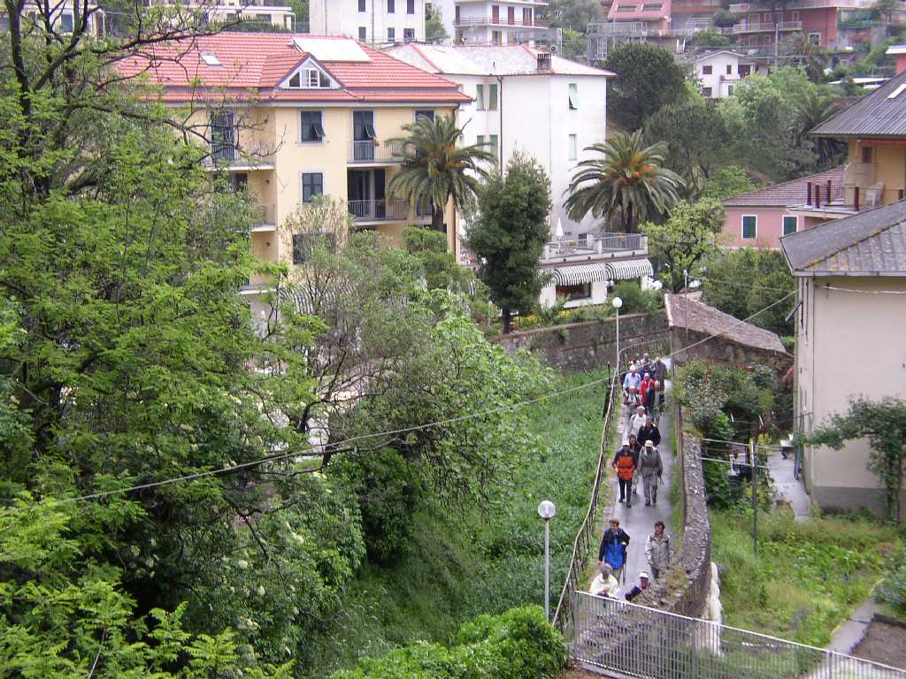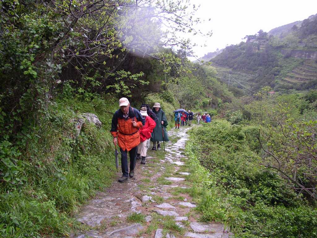 Es fängt leicht zu regnen an. Der Wanderweg führt stetig bergan, entlang eines kleinen Wildbachs, vorbei an alten Bauernhöfen, durch Nadelwald, vereinzelt stehen schon Edelkastanien. Der Rest des alten Wallfahrtsweges ist fast eben und gepflastert. Er führt durch bebaute und verlassene Terrassenkulturen. Zwischen Macchiagestrüpp geht es hindurch bis hinauf zum Wallfahrtsort auf 350 m. Immer wieder gibt es auf diesem letzten Wegabschnitt Blicke auf die Küste und auf Riomaggiore. |