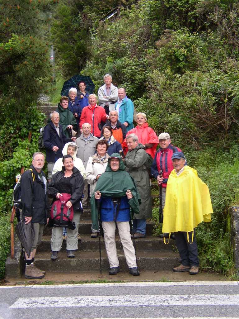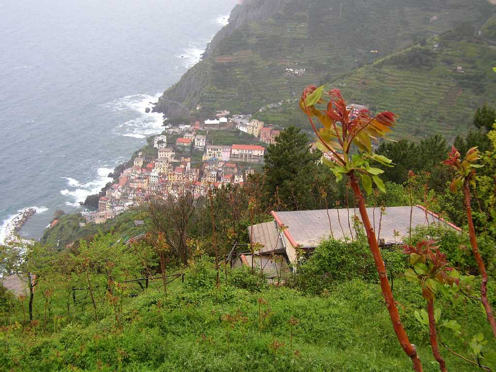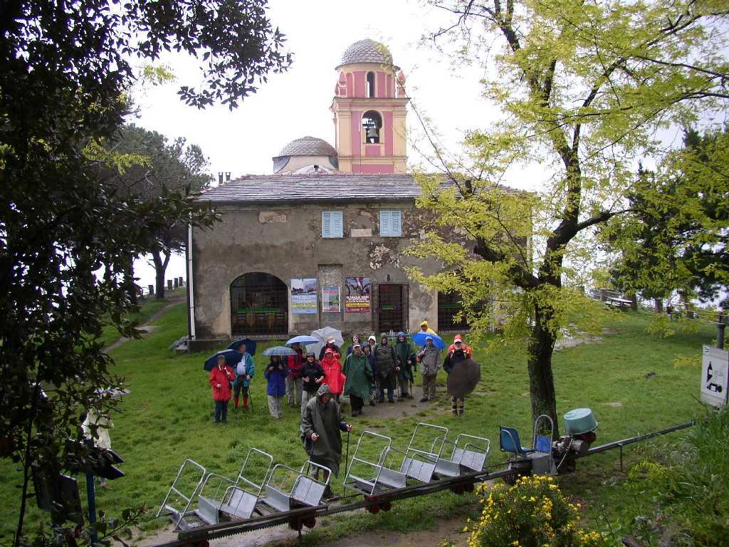 Montenero zu gelangen. Es regnet nach wie vor noch immer. Jeder sucht sich ein trockenes Plätzchen, isst etwas und schaut dabei hinunter auf Riomaggiore. Der Himmel ist bewölkt, es regnet, so fällt der Abschied nicht allzu schwer. |