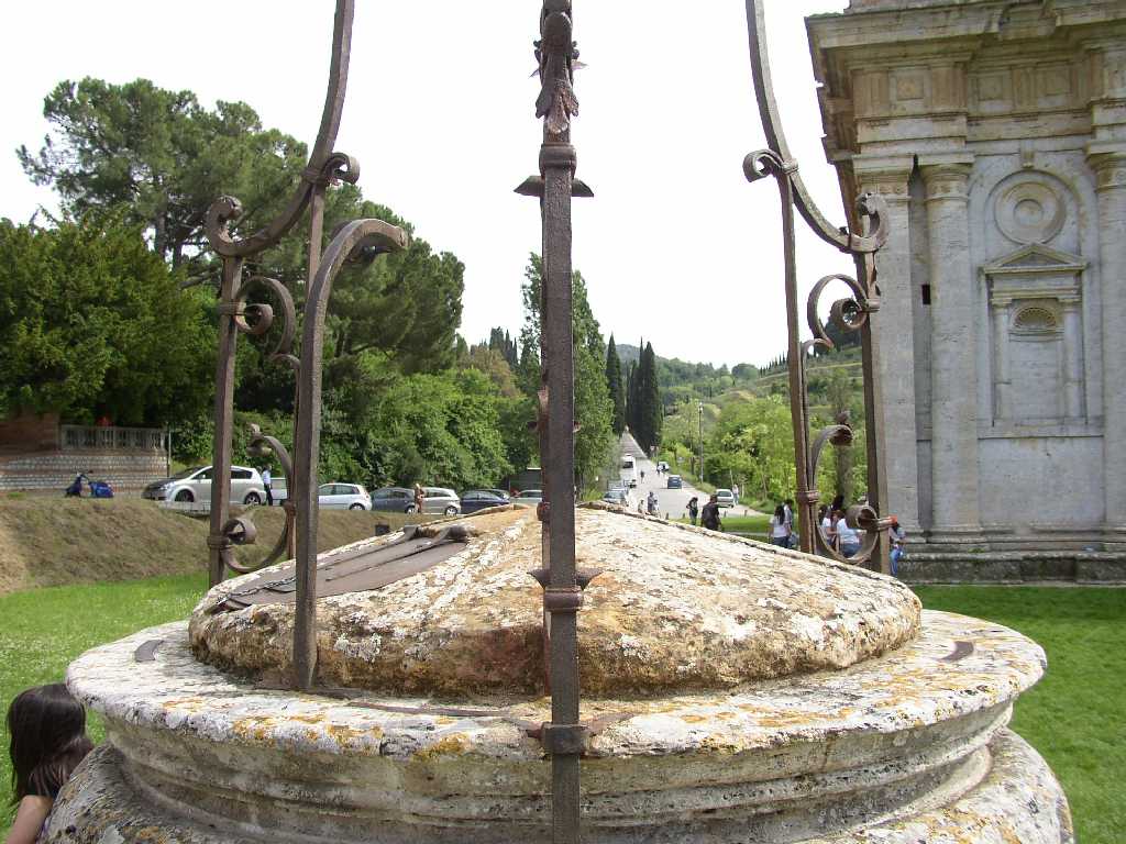 etruskischen Säulen ruht ein mächtiger Brunnenbalken, auf dem zwei