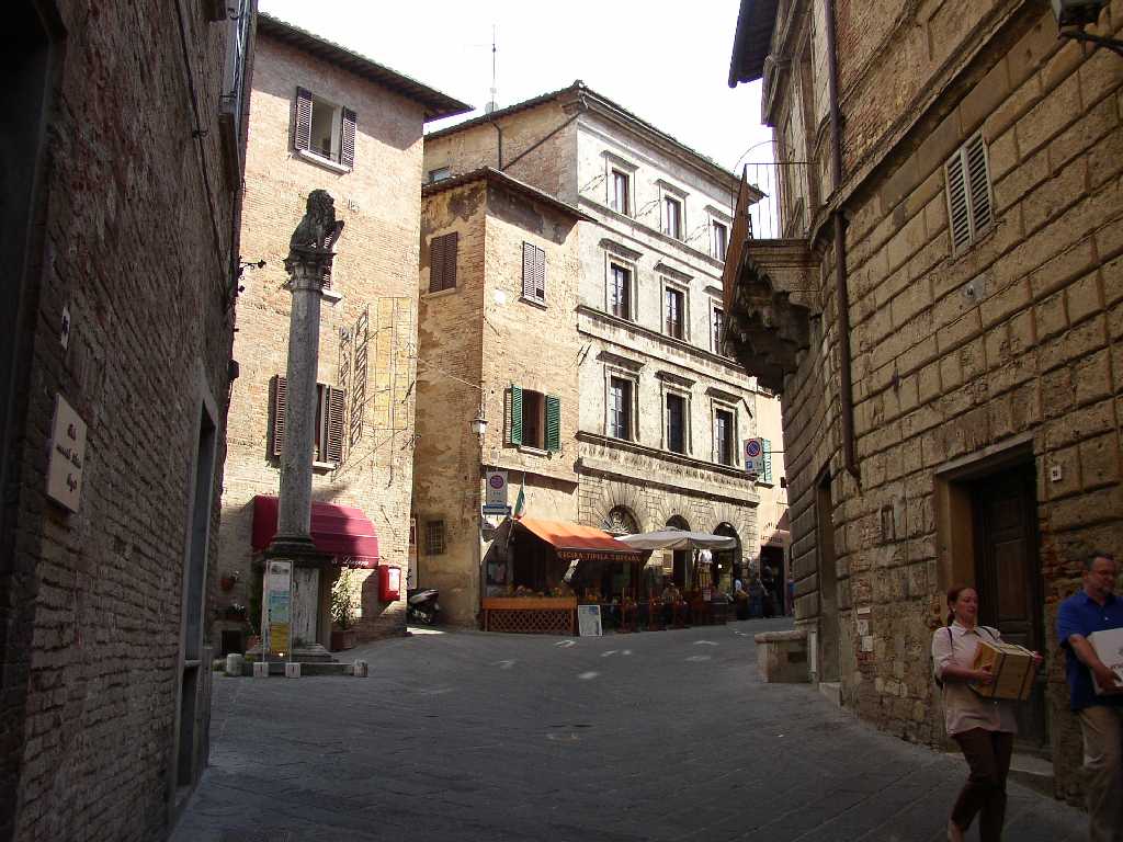 die backsteingepflasterte Piazza Pio II. mit den angrenzenden Bauten war